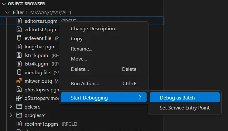 After configuring the Debug Service, launching a debug session is a click of a button away. To start a batch debug session, right-click on a program object from the Object Browser and select the Start Debugging > Debug as Batch action.