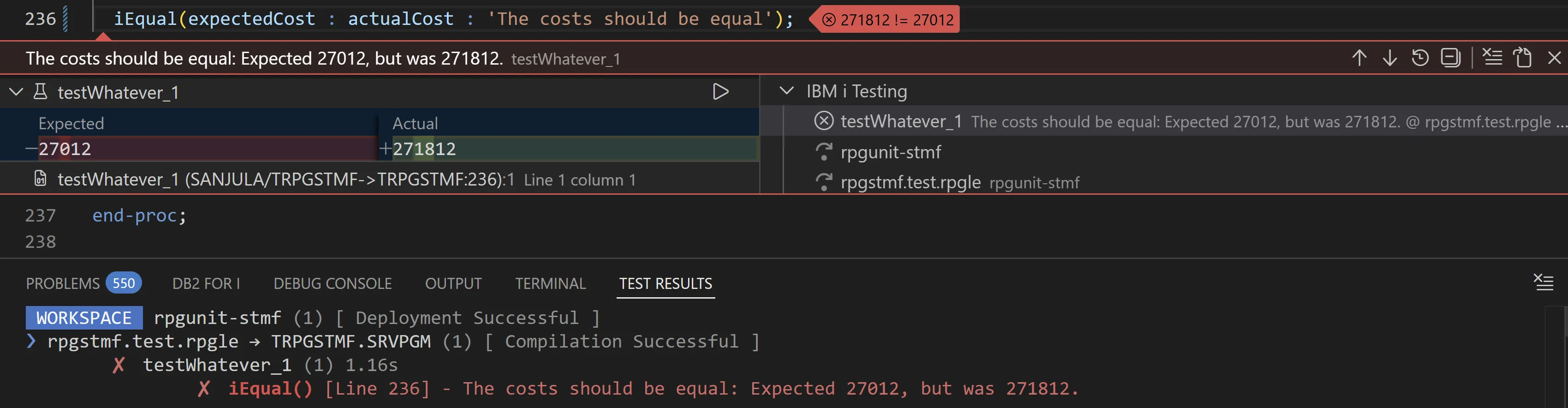 /home/<user>/builds/<workspace-folder>/. This is the same deployment process that takes place when you compile any local files via Code for IBM i. - Read Compile Configuration: To customize the parameters used to compile your tests, a global and directory specific test configuration file will be read. Learn more about this in the Compile Configuration section.