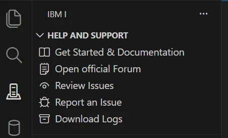 The HELP AND SUPPORT view provides a link to the documentation, and links to get help and support should you encounter any issues in Code for IBM i.