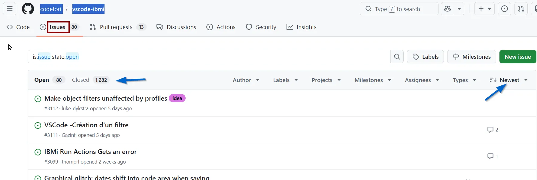 You can see all open or closed issues reported since the start of the project and sort them by date.