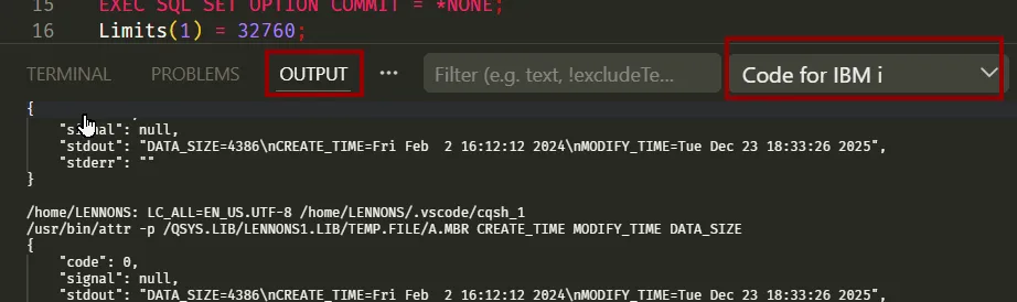OUTPUT tab and select Code for IBM i. Select the complete displayed contents and then copy and paste into the Github issue.: